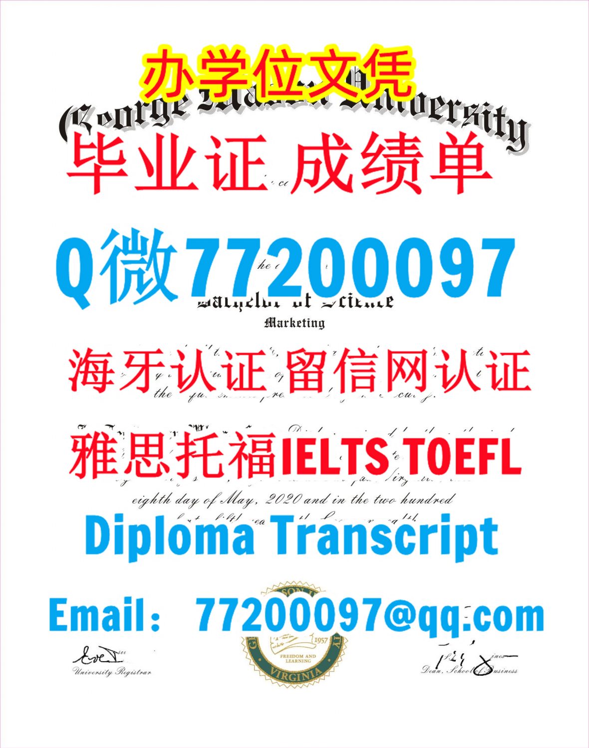 GMU文凭证书办理乔治梅森大学文凭成绩单Q/微:77200097有GMU学位证书精仿GMU毕业证书能办GMU成绩单制作乔治梅森大学文凭证书雅思托福George Mason University Bachelor/Master Diploma Degree Transcript