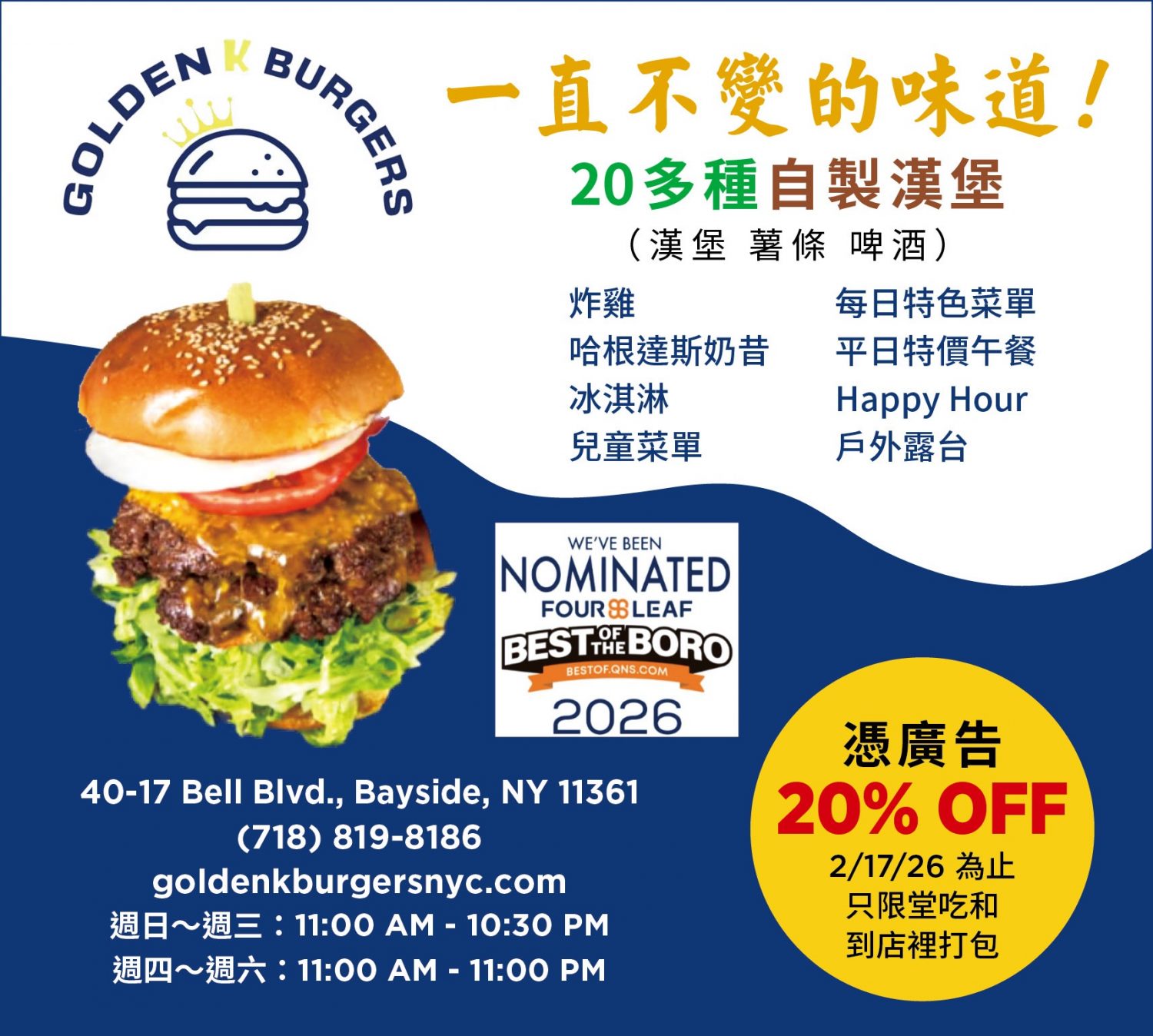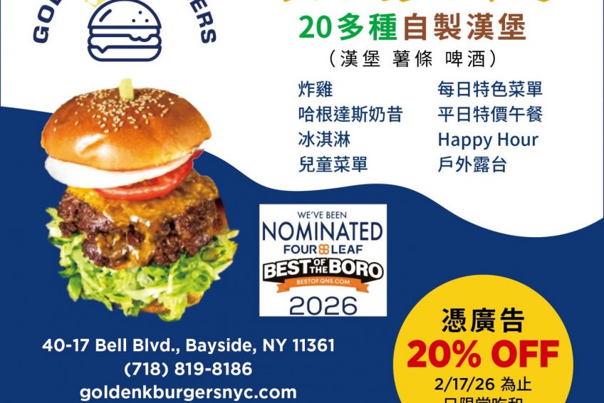 注:即日起至2025年12月31日期间,大纪元读者凭本文或报纸广告可享Golden K Burgers八折优惠,包括堂吃、外卖及网购送餐。 ◇