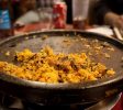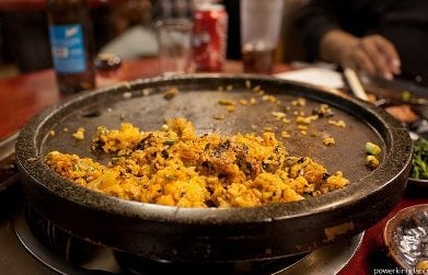 洛杉磯韓國城有數不清的烤肉店,但每天晚上排隊最長的,要數6街上的這家Hae Jang Chon烤肉店,週末至少得等上兩小時才能入座,味道則一定讓你不失望。 Hae Jang Chon烤肉店坐落在6街一個小小的商業廣場內,遠遠看到一個小豬招牌和大批人潮,店面不大,門口排隊的人比店內顧客還多,看看排隊的人就知道這家生意有多火爆。這裡晚餐是20美元的,店家效率很高,還未落座,桌上就擺滿了各種小菜和配菜,無限量供應蔬菜沙拉,還贈送韓國泡菜烤餅和水蒸蛋,燒烤鍋不同於其他燒烤店的鐵板,而是厚實的石板,服務員手腳麻利地將鐵板刷上油,等待烤肉上場。自助餐有十幾種肉類可選,包括牛排丶牛肋丶牛舌丶五花豬肉丶豬肩肉丶雞肉丶魷魚等等,這里以肉類新鮮丶食材一流出名,愛吃烤肉的人都能分辨出這裡烤肉品質有多高,烤肉汁醃製過的肉依然有濃濃的新鮮口味,牛排肉質彈牙,豬肩肉油滋滋又香嫩不老。吃烤肉的時候可以搭配店家自己醃製的白蘿蔔,酸甜可口的蘿蔔很解膩,四種口味的蘸料包括香油丶蒜泥辣醬丶豆瓣醬丶甜酸汁,可搭配不同肉類。吃到最後,服務員會端來一碗溷合韓國辣泡菜和紫菜的米飯,倒在石板上,大火快炒,米粒溷合烤肉香味,炒到香脆,辛香可口。想到這家韓國城最受歡迎