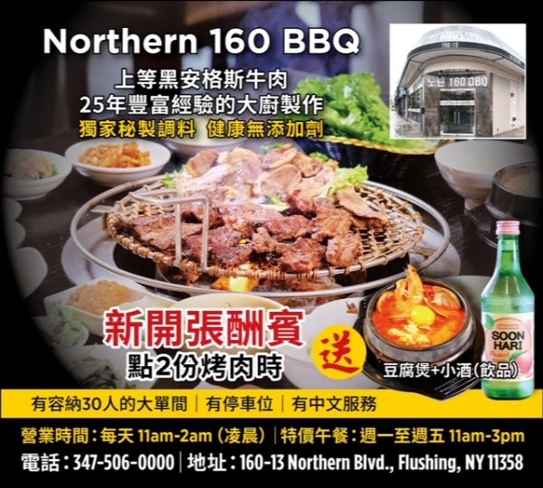 装饰一新的Northern 160 BBQ能容纳130多人,还有30人的单间,非常适合亲朋好友年节聚会。餐厅外有停车位。新张酬宾期间,点两份烤肉,赠送一份豆腐煲+韩国小酒/饮料。