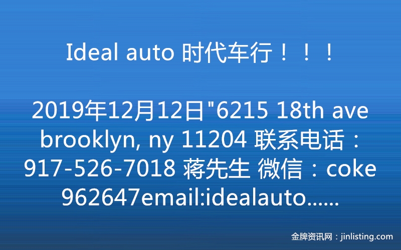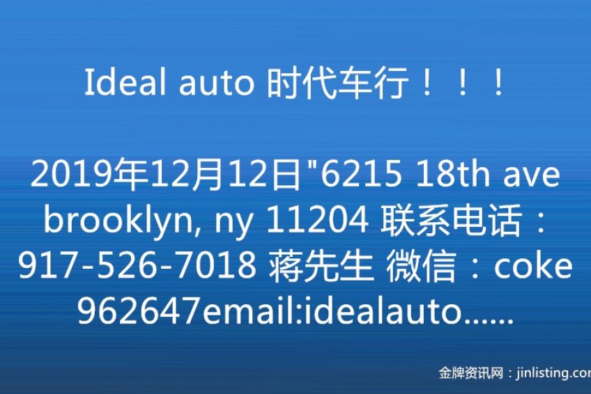 “Ideal auto 时代车行!!! 6215 18th ave brooklyn, ny 11204 联系电话:917-526-7018 蒋先生 微信:coke962647 email: idealauto.qing@gmail.com 我们在汽车方面的服务是最好的, 最全面的。 新车/旧车/保险/撞车 等关于车的一切都可以来找我。”