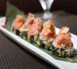 Fire Ball king crab and seaweed salad wrapped by salmon with momichi sauce and basil oil.  10.00