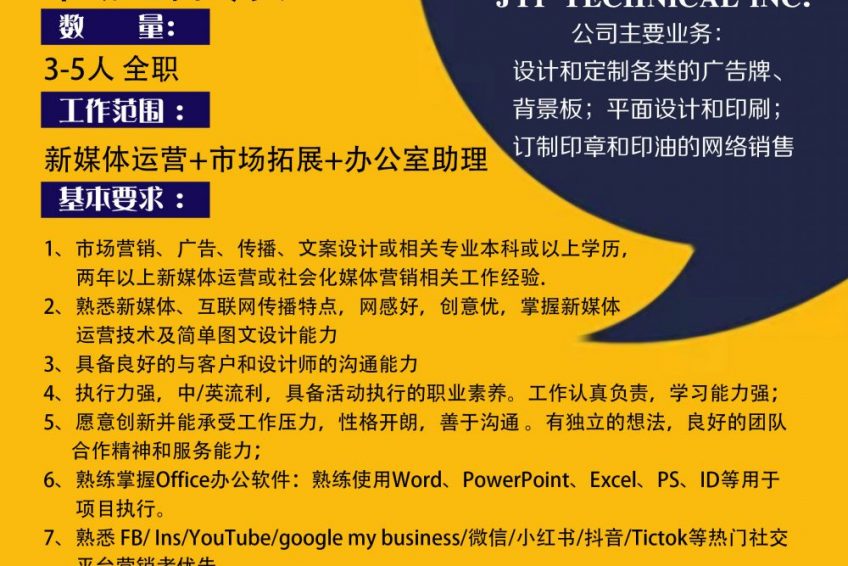 7、熟悉 FB/ Ins/YouTube/google my business/微信/小红书/抖音/Tictok等热门社交平台营销者优先。