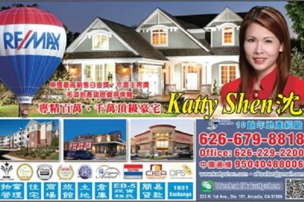 南加州最著名千万杰出房地产经纪 KATTY SHEN(),拥有Re/Max 最高荣誉主席奖(Chairman’s Club Award),最高销售白金奖 ( Platinum Club Award) 、总统及国际钻石奖. 十多年专业房地产经验,是Arcadia MLS协会委员及美国房地产协会会员,拥有多项专业国际地产资格认证。同时是Re/ MAX Premier销售冠军、e- Land土地开发顾问、Champion房产管理顾问。拥有强大的经纪团队阵容为您服务。
