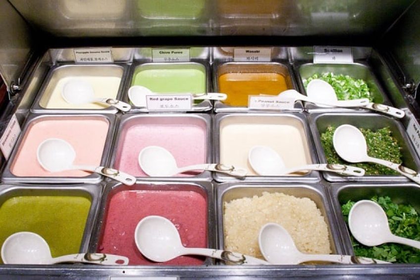 开始选蘸料了,有20多种,菠萝芝麻味,韭菜味,胡荽叶味,芥末味,草莓味,葡萄味……,正在犹豫时,店员向我们推荐了店家自制的特色酱料。