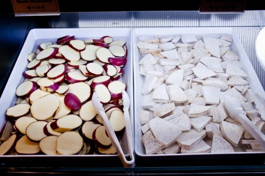 点完了蔬菜,到了主食区,各种口味的鱼丸,鱼饼,鱼豆腐,虾丸应有尽有,嫩豆腐,干豆腐,腐竹,莲藕,竹笋,也齐齐地摆在上面。有几样特别的食物吸引了我们的目光,俗语海带耳)和一种英文名叫Seaweed Fulvescens的海草。店员介绍说,这是特别从韩国空运而来的健康养生食材,价格不菲,味道鲜美。还有这份看起来非常普通的芋头也是从韩国空运而来当然,零热量的魔芋和补血排毒的甜菜也一定要在我的餐盘里。