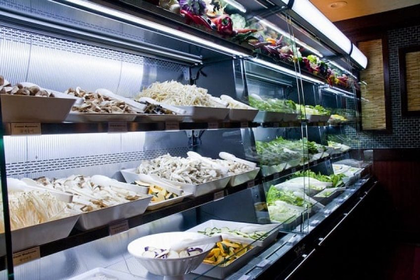 朋友点了猪骨汤底,喜爱海鲜的我当然要了鲜美的小黄鱼汤底。饥肠辘辘的我们开始选菜了。先到了蔬菜区,哇,这么多,怎么选啊?中,外超市里能见到的所有蔬菜几乎都在这里,我数了数,40多种,不仅有常见的南瓜,菠菜,豌豆,西兰花,西葫芦,玉米,还有红苋菜,茼蒿,羽衣甘蓝,雏菊叶,瑞士甜菜等精品时蔬,满满地摆在架子上,鲜嫩欲滴。光是我喜欢的蘑菇就有6,7种。