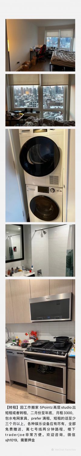 因工作搬家5Pointz高层studio出短租或者转租,二月份至年底,月租3300,包水电网家具,prefer满租,短租的话至少三个月以上,各种娱乐设备应有尽有,全部免费赠送,离七号线两分钟路程,楼下traderjoe非常方便,欢迎咨询,微信xjh1019,需要押金。 添加微信看全部图片。