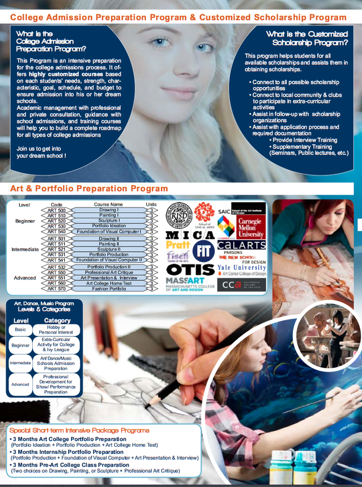 我们提供多种语言课程,包括一般英语,商业英语,实用英语,托福,TOEIC, SAT, GRE 等多项考试准备课程.其它项目更包括 转学,申请学校,艺术, 2D/3D 电脑课程及实习机会.