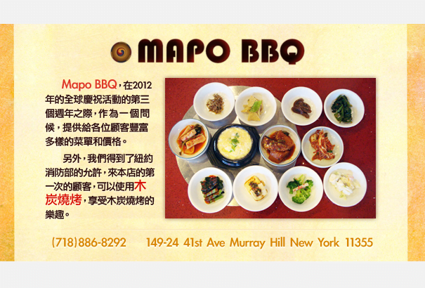 介绍:在2012年的全球慶祝活動的第三個週年之際,Mapo BBQ,作為一個問候,提供給各位顧客豐富多樣的菜單和價格。另外,我們得到了紐約消防部的允許,來本店的第一次的顧客,可以使用木炭燒烤,享受木炭燒烤的樂趣。