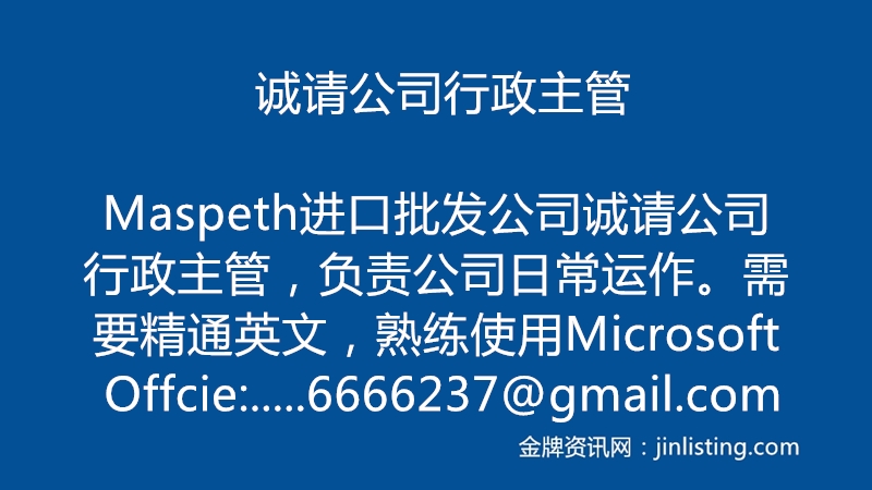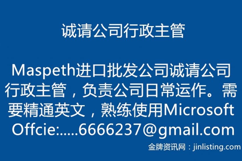 Maspeth进口批发公司诚请公司行政主管,负责公司日常运作。需要精通英文,熟练使用Microsoft Offcie: (Word, Excel, Powerpoint etc), QuickBooks, Must be a Multi-tasker。需要报税。薪资面议。请发简历至:6666237@gmail.com
