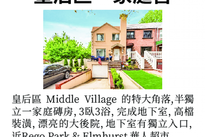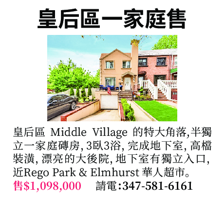 漂亮半獨立一家庭磚房,位于皇后區中村的特大角落, 3臥3浴,完成地下室,高檔裝潢,美麗后院及側院,地下室有獨立入口,交通便利,近Rego Park & Elmhurst 華人超市,售$1,098,000, 電:Vincent (347) 581-6161