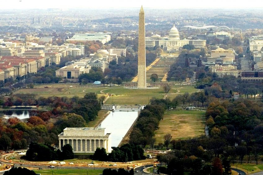 国家广场(National Mall)是美国华盛顿特区的一处开放型国家公园,西起林肯纪念堂一直延伸到国会山,包括华盛顿纪念碑、国家历史博物馆、华盛顿联邦火车站、杰斐逊纪念馆、罗斯福纪念馆等著名建筑物。其中美国国会大厦因为坐落在25米的全城最高点而得名国会山,国会山是美国国会办公机构的国会建筑,同时也是美国历史上重大示威游行、民权演说的重要场地。从国会山往林肯纪念堂方向走,角度合适的话,能看到华盛顿纪念碑在100米宽几百米长的反省池(reflection pool)中倒影和巨碑笔直相连,设计非常巧妙。这里游人不是非常多,你可以感受到身为首都和政权核心区域的那份庄严。