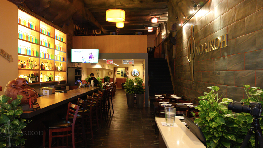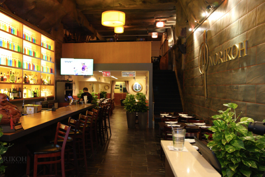 Norikoh Ramen chicken and premium soy sauce based stock garnished with scallions, bamboo shoots, red ginger and char siu pork, with hard boiled egg.  14.25