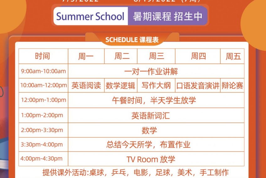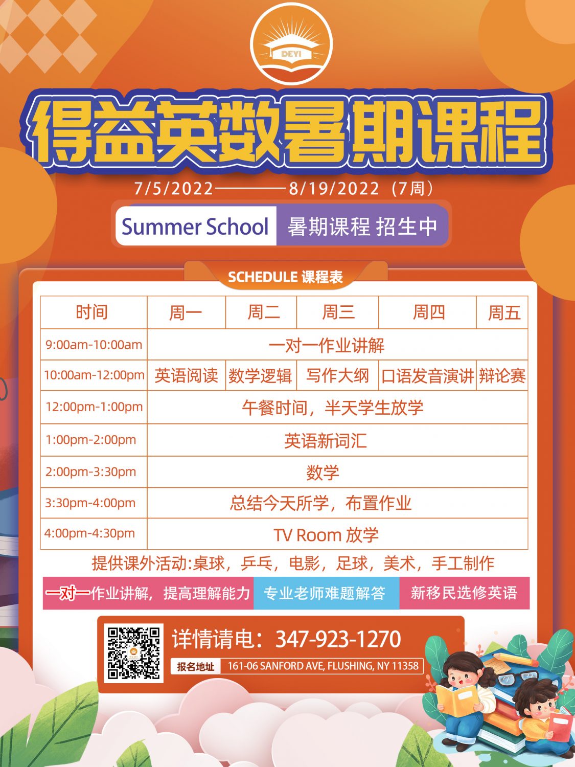 得益从即日起开始接受暑期班报名。暑期班预计从2022年7月5日开课,8月19日结束,为期7周。课程内容包括英语阅读、写作、口语发音、新词汇、辩论比赛、数学。提供一对一作业讲解,让学生真正理解并掌握所学内容。ESL选修课程,帮助新移民学生提高英语听力和口语。