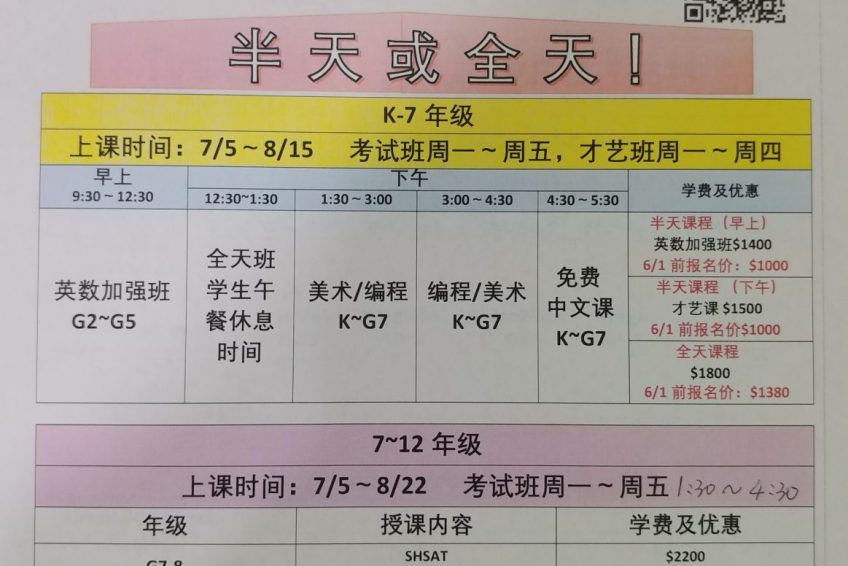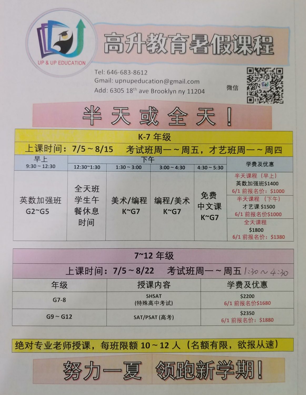 高升的暑假课程从7月5日至8月15日,课程分为全天班和半天班两种。招收从幼儿园至12年级学生。课程包括英语、数学加强班、特殊高中考试补习班,美术、编程、珠心算班,另有免费中文课。小班教学,每个班人数限制在10~12人,想要参加的请抓紧报名!