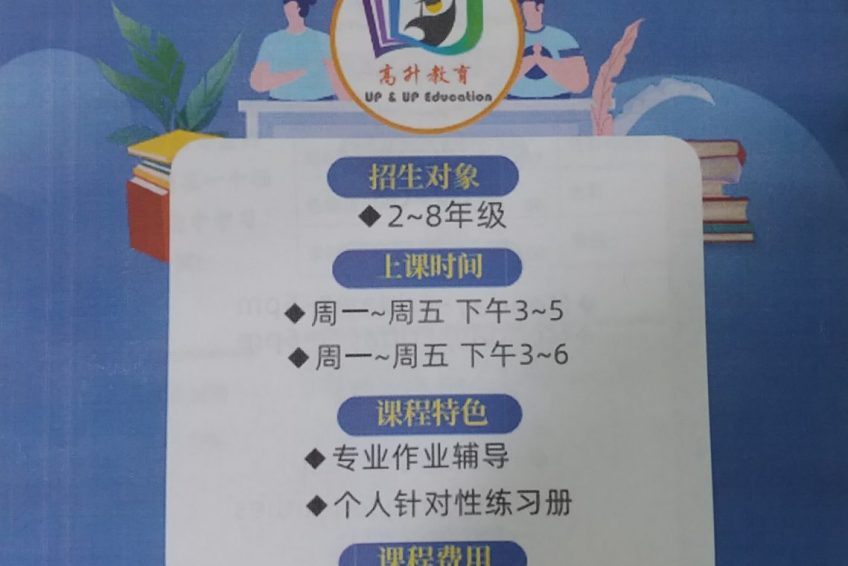 上课时间是周一~周五下午,有2小时和3小时(3点至5点或3点至6点)课程可供选择。课程收费$180/月或$250/月。通过高升测试即可享受5折优惠。