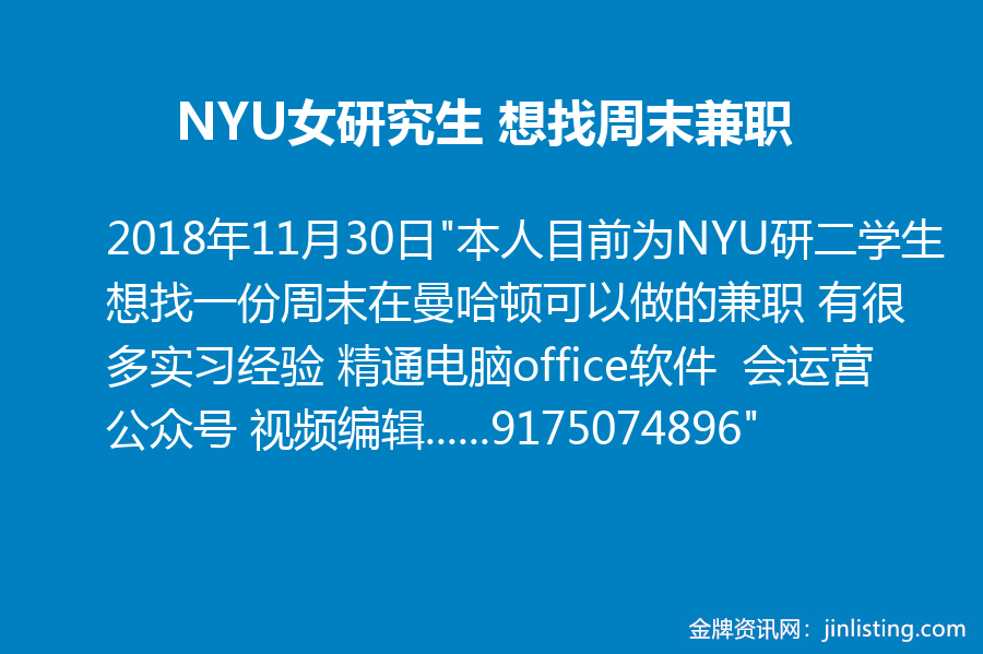 “本人目前为NYU研二学生 想找一份周末在曼哈顿可以做的兼职