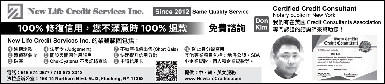 如果您住在大纽约地区,需要信用记录修复,在此向您推荐新生活信用修复公司。这是一家位于纽约法拉盛的专业从事信用记录修复的公司,团队成员都接受过最新法律、法规、和Credit Consultant Association正规机构认证和培训。凭借丰富的经验和专业精神,公司成立至今成功帮助无数顾客快速修复了信用记录。