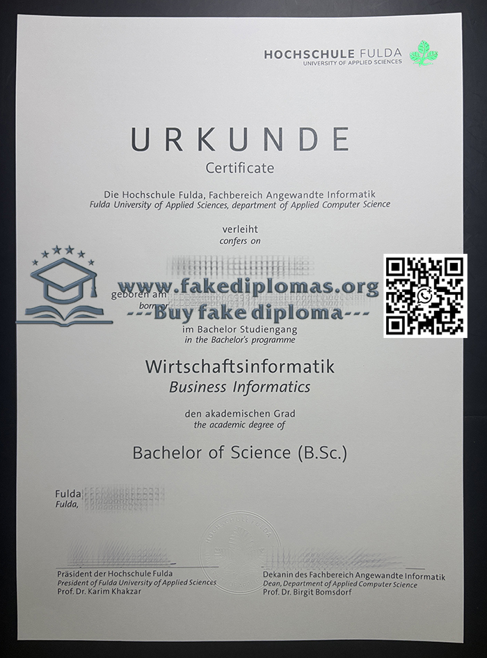 Fulda University of Applied Sciences (officially named Hochschule Fulda – University of Applied Sciences) is located in the city of Fulda, within the Fulda district of Hesse, southwest Germany. Get a Hochschule Fulda University of Applied Sciences fake certificate, Obtain Hochschule Fulda University of Applied Sciences fake degree online.