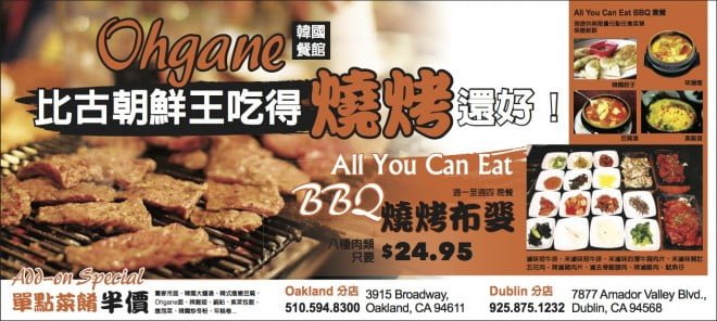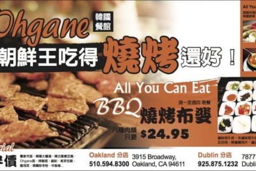 比古朝鲜王吃得烧烤还好 韩国BBQ烧烤布斐,八种肉类只要$24.95,味噌炖、韩国饺子、豆腐汤、蒸鸡蛋。单点菜肴半价:荞麦冷面、韩国大酱汤、韩式炖嫩豆腐、Ohgane面、辣鸡翅、锅贴、紫菜包饭、炖泡菜、韩国炒冬粉、年糕卷…