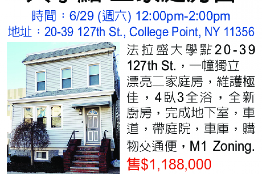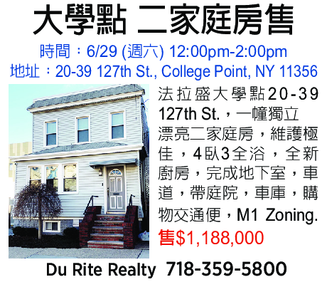 法拉盛College Point的20-39 127th Street,一幢獨立,漂亮的二家庭房,維護極佳,4臥3全浴,全新廚房,完成地下室,車道,帶庭院,車庫,購物交通便利,M1 Zoning, 售$1,188,000