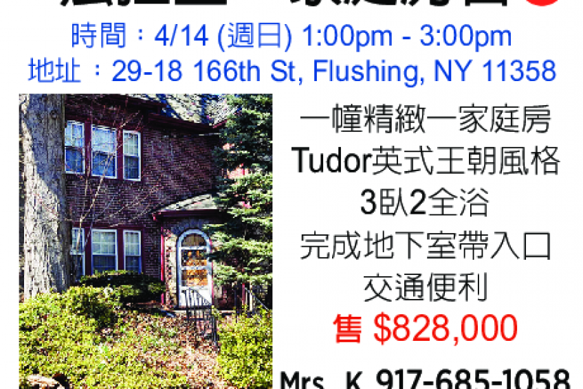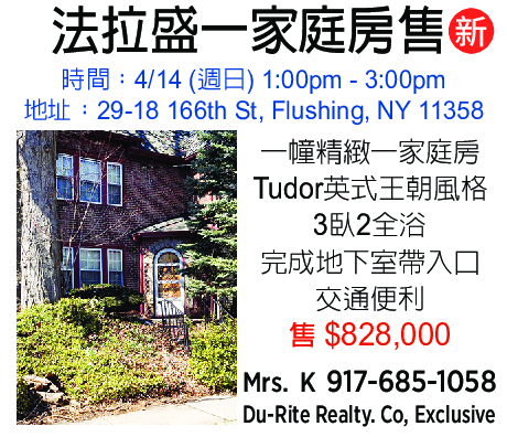 OPEN HOUSe 發拉盛一家庭房售 917-685-1058