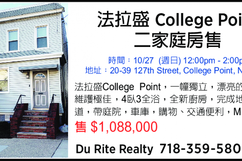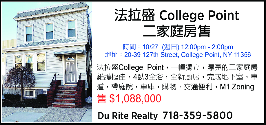 法拉盛College Point的20-39 127th Street,一幢獨立,漂亮的二家庭房,維護極佳,4臥3全浴,全新廚房,完成地下室,車道,帶庭院,車庫,購物交通便利,M1 Zoning, 售$1,088,000