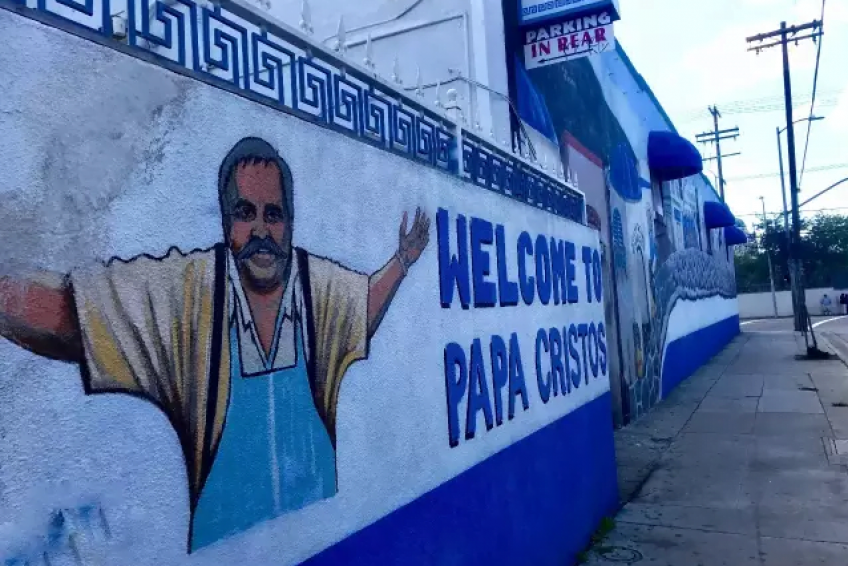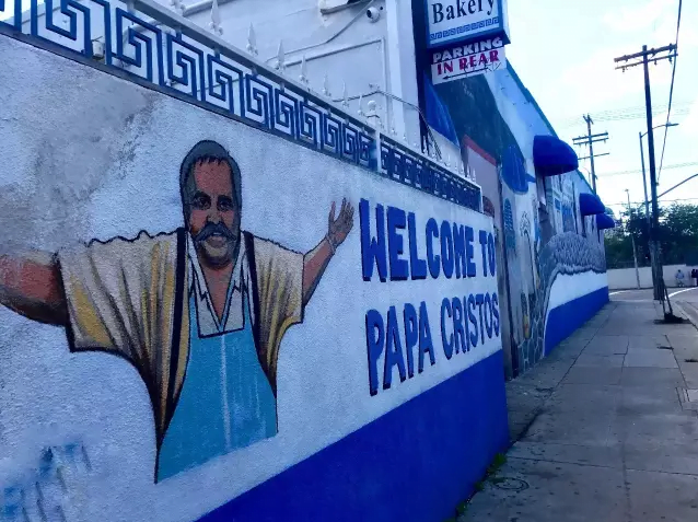 在洛杉磯市中心和韓國城之間,有一家餐廳的塗鴉牆非常醒目,每次一路過就有一種路過聖托尼里的感覺。這家餐廳叫Papa Cristo’s,是一家希臘和地中海風味的餐廳。這家餐廳yelp評分有數千個近五星,大家也不妨去感受一下。最有趣的在於,這家餐廳的年紀和對面的希臘教堂一樣,都是建於1948年。馬路對面的教堂也叫聖索菲亞大教堂,是希臘移民模仿土耳其的聖索菲亞大教堂而修建的。