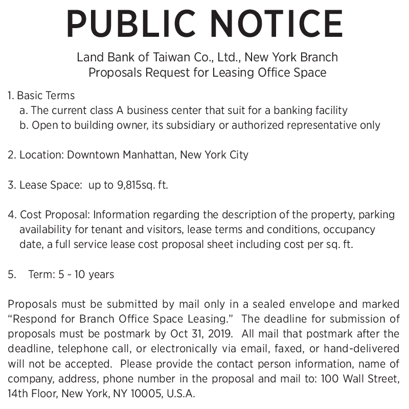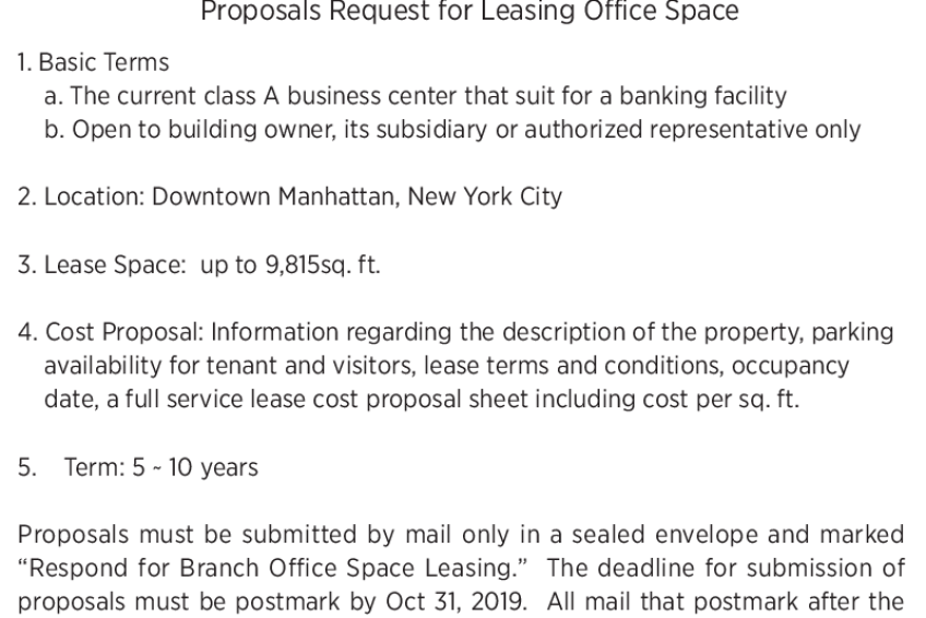 Proposals must be submitted by mail only in a sealed envelope and marked “Respond for Branch Office Space Leasing.” The deadline for submission of proposals must be postmark by Oct 31, 2019. All mail that postmark after the deadline, telephone call, or electronically via email, faxed, or hand-delivered will not be accepted. Please provide the contact person information, name of company, address, phone number in the proposal and mail to: 100 Wall Street, 14th Floor, New York, NY 10005, U.S.A.