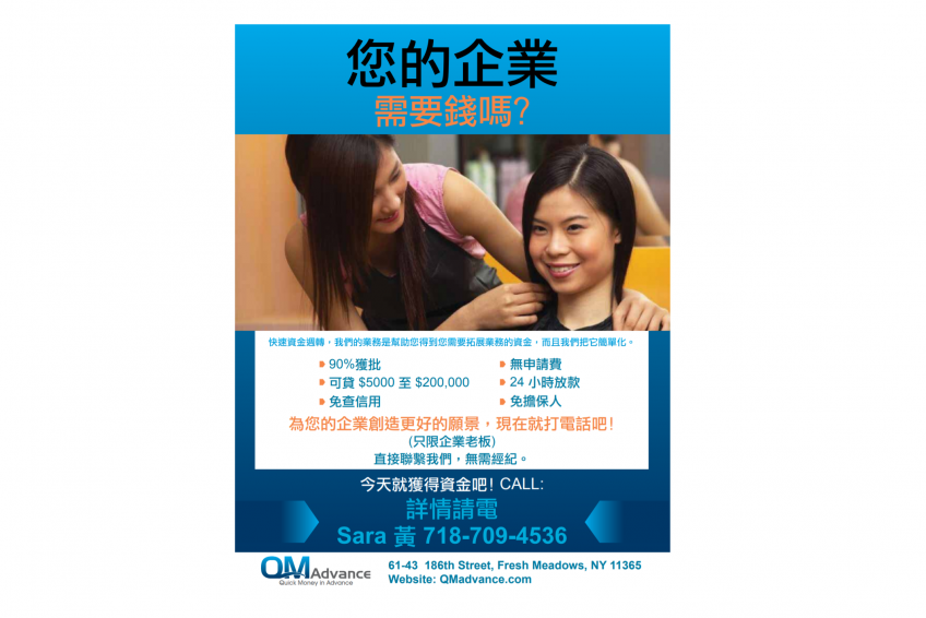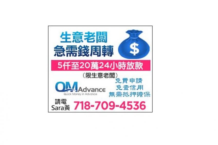 QM Advance 小商家快速資金周轉貸款 請電: 718-709-4536 纽约小商业贷款