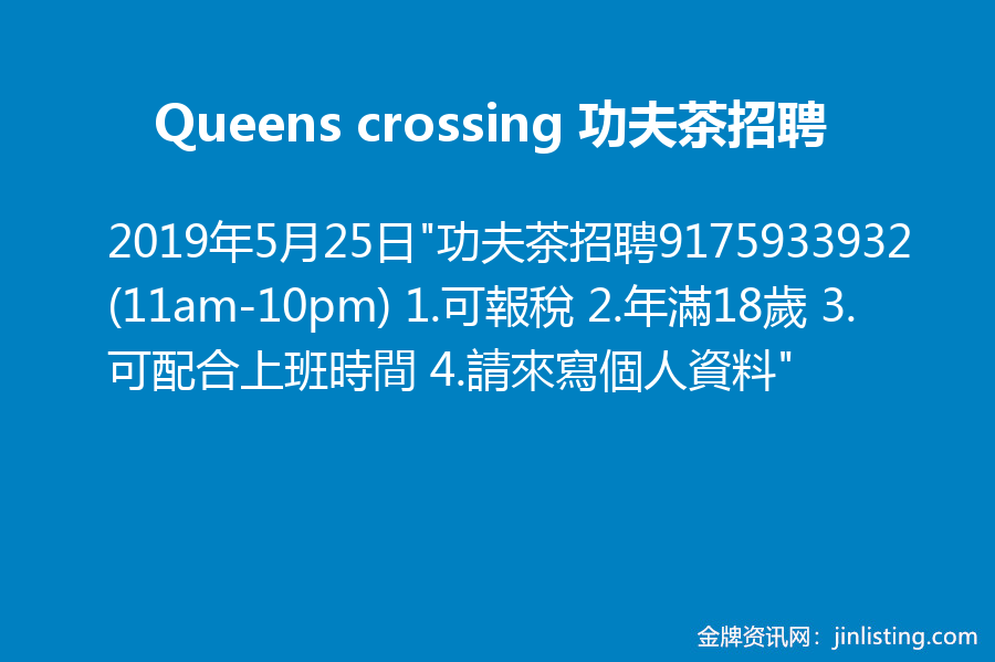 Queens crossing 功夫茶招聘 “功夫茶招聘 9175933932 (11am-10pm) 1.可報稅 2.年滿18歲 3.可配合上班時間 4.請來寫個人資料”