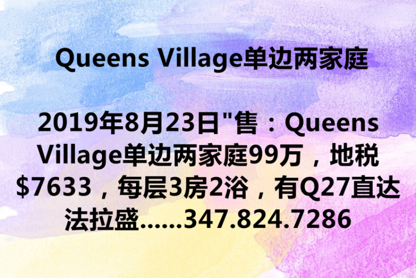 “售:Queens Village单边两家庭99万,地税$7633,每层3房2浴,有Q27直达法拉盛,近超市。欢迎约看347.824.7286 售:Maspeth单边两家庭124.85万,一楼2房1浴,二楼3房1浴,地下室独立出入,地税6895,房20 ft x 50 ft,欢迎约看347.824.7286 售:E. Elmhurst单边两家庭89.9万,每层2房1浴,地税$5,918,完成地下室有装修,欢迎看房347.824.7286 售:法拉盛 独立一家庭93.8万,超大地115.83 x 86.92 ,屋大43 x 36 ,地税仅$8,148,现有4房3浴,近一切,安排优美的社区,交通方便,生活机能强。超大的地可以改建豪宅。更多信息请约347.824.7286 售:新鲜草原一家庭两家庭使用89.9万,4房2.5浴,新装修,近一切,欢迎约看347.824.7286 以上房源请电欢迎约看347.824.7286,或加微信手机同号。“
