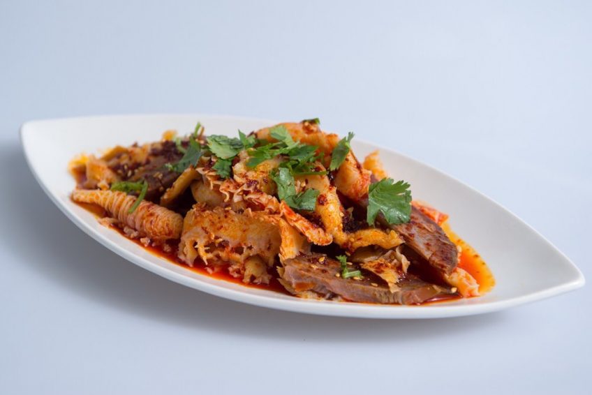 Pad Chili Dish very spicy. sautéed red chili paste with asparagus, kaffir lime leaves, krachai herb, fresh peppers, pink peppers, & basil.