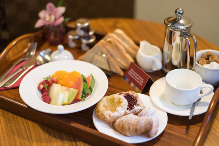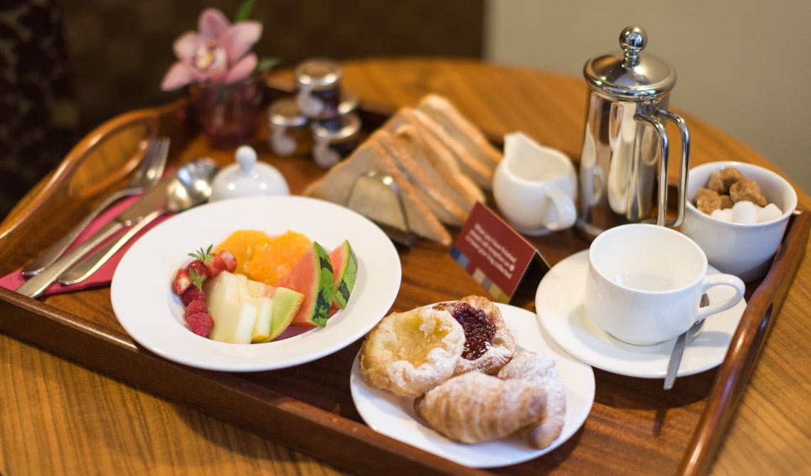 Room Service Pad Thai sautéed glass vermicelli with shrimp, mixed seafood, mangoes, brown tofu, bean sprouts, scallions, crushed peanuts, tamarind juice & purple coconut milk beet sauce, wrapped in an egg white crepe.  15.90