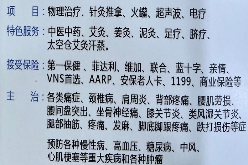 项目:物理治疗,针灸推拿,火罐,超声波,电疗。