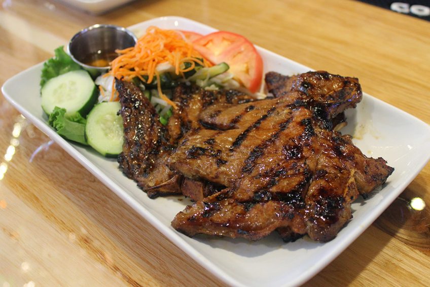40. Suong Nuong grilled pork chop. grille marinated pork chops with lemongrass, served with pickled salad, tomato, cucumber and nuoc cham sauce  14.75