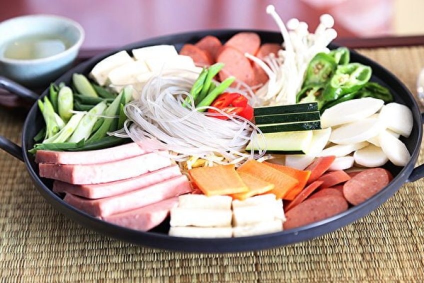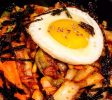 听了店主人的故事,我们更急切地想品尝他们的菜肴了。第一个端上来的菜就令我们眼前一亮,摆设得好精美、好漂亮,盘内八小团红、黄、白、绿的菜和肉,颜色交错地均匀分布成一圈,有蛋白丝、蛋黄丝、香菇丝、黄瓜丝、胡萝卜丝、豆芽、牛肉丝和小虾,簇拥著盘中心的奶白色小煎饼,煎饼是用黏米粉和面粉做成,煎得非常薄。用小煎饼卷上各种菜肉丝,再蘸上特制的酱汁,味道太棒了!店主人说,这道菜叫九折坂,是古时候皇帝的御用菜,在韩国,也是用来招待尊贵的客人的。八种肉、菜加上中间的小煎饼,共九样,所以叫九折板。属于开胃菜。