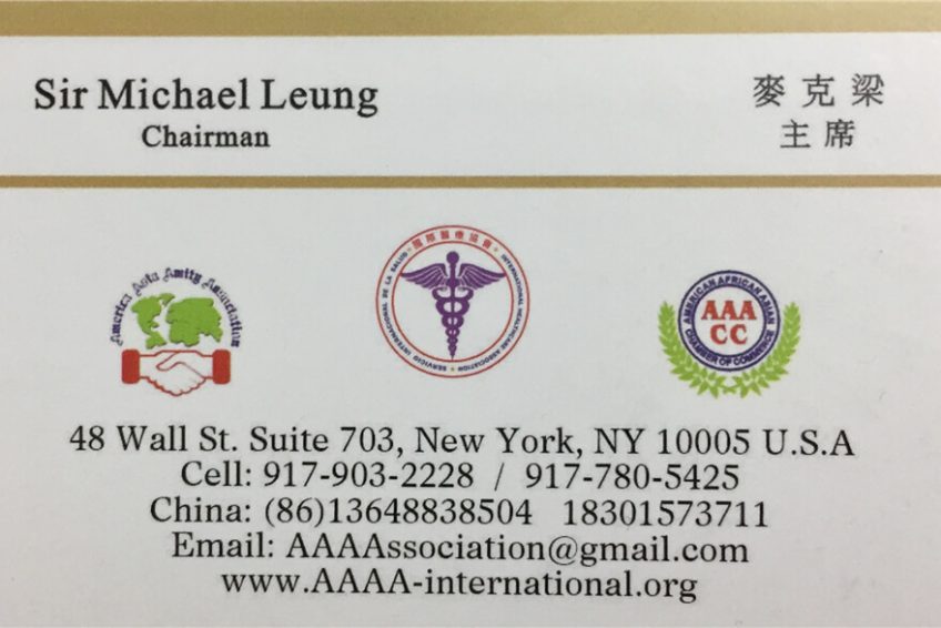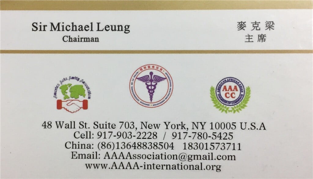Sir Michael Leung Chairman 麥克梁 主席 48 WaIl St. Suite 703, New York, NY 10005 U.S.A Cell: 917-903-2228/917-780-5425 China: (86)13648838504 18301573711 Email: AAAAssociation@gmaiI.eom www.AAAA-international.org