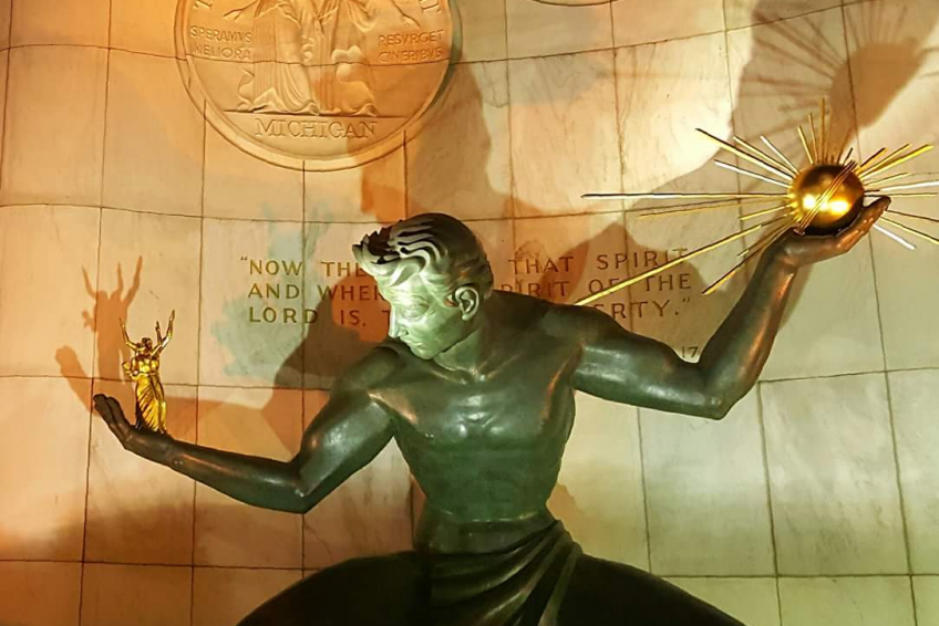 “底特律精神”雕像位于伍德沃德大道,为纪念著名拳王Joe Louis于1955年建造,如今已成为底特律精神象征的标志之一。雕像背靠一面高墙,左手持有象征神的镀金青铜放射状球体,右手托举着一家人,是前往底特律不得不看的景点。