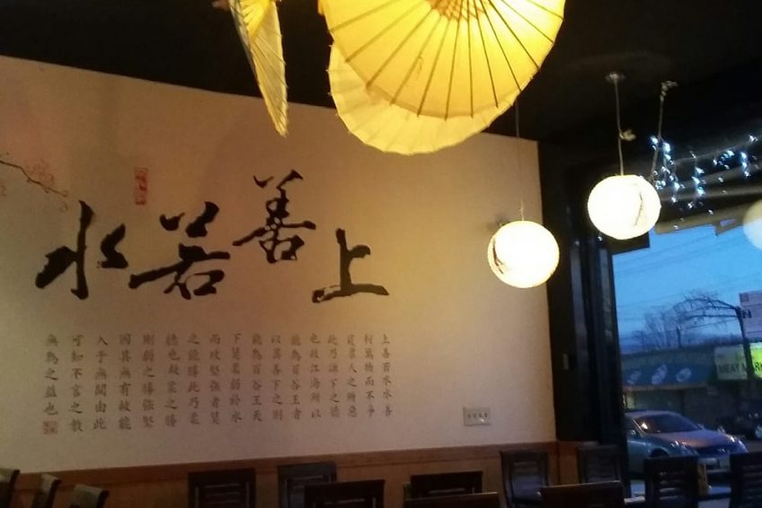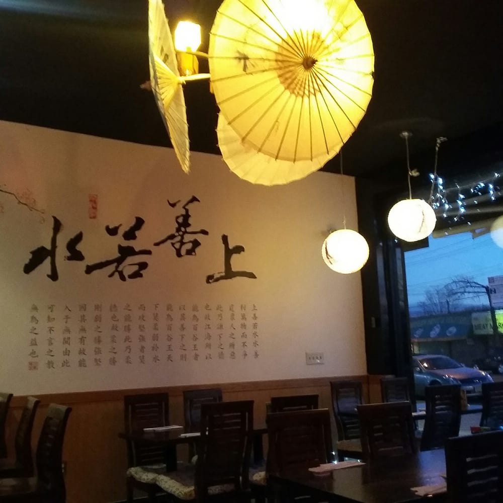 Fresh chicken broth with beef dumplings, chicken pieces, celentani pasta, vegetables, and swiss chard.