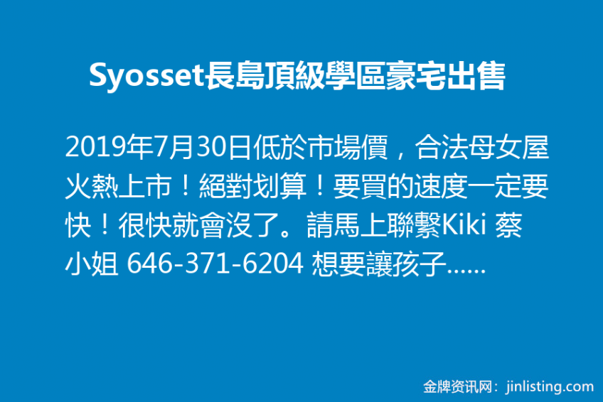 Syosset長島頂級學區豪宅出售 – 低於市場價,合法母女屋 火熱上市!絕對划算!要買的速度一定要快!很快就會沒了。請馬上聯繫Kiki 蔡小姐 646-371-6204 想要讓孩子享用到全美/全紐約都有排名的學區卻苦惱房價太貴?往這邊看來!一個絕好的機會讓你毫無經濟壓力給孩子提供最好的學習環境。 38 Edna Dr, Syosset 長島頂級學區超大一家庭 5 個超大臥室,2 大客廳,2 廚房,3 衛浴,2 試衣間,完成全新地下室。全新屋頂/車庫/地下室,室內裝潢選用高級材料。土地:70X150,屋子面積:3620 尺,地稅:$26,367/年(還可申請減免)現為合法母女屋!
