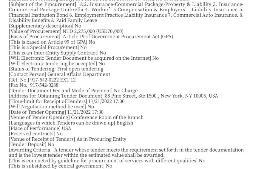 [Procuring Entity] Land Bank of Taiwan, New York Branch