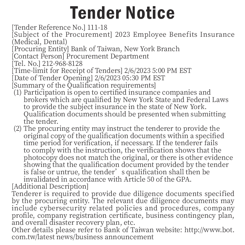 [Tender Reference No.] 111-18 [Subject of the Procurement] 2023 Employee Benefits Insurance (Medical, Dental) [Procuring Entity] Bank of Taiwan, New York Branch [Contact Person] Procurement Department [Tel. No.] 212-968-8128 [Time-limit for Receipt of Tenders] 2/6/2023 5:00 PM EST [Date of Tender Opening] 2/6/2023 05:30 PM EST [Summary of the Qualification requirements] (1) Participation is open to certified insurance companies and brokers which are qualified by New York State and Federal Laws to provide the subject insurance in the state of New York. Qualification documents should be presented when submitting the tender. (2) The procuring entity may instruct the tenderer to provide the original copy of the qualification documents within a specified time period for verification, if necessary. If the tenderer fails to comply with the instruction, the verification shows that the photocopy does not match the original, or there is other evidence showing that the qualification document provided by the tender is false or untrue, the tender’s qualification shall then be invalidated in accordance with Article 50 of the GPA. [Additional Description] Tenderer is required to provide due diligence documents specified by the procuring entity. The relevant due diligence documents may include cybersecurity related policies and procedures, company profile, company registration certificate, business contingency plan, and overall disaster recovery plan, etc.