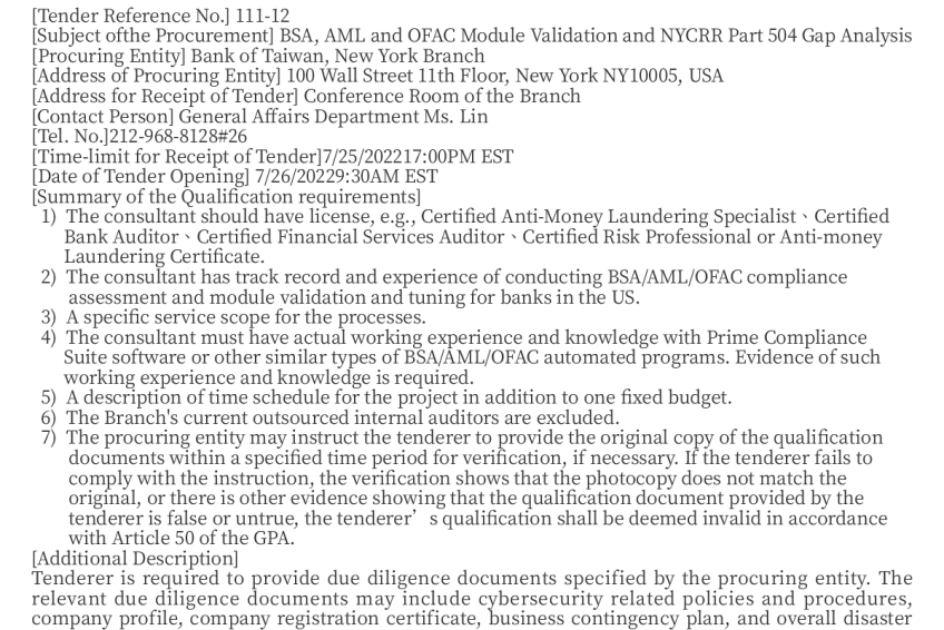 [Procuring Entity] Bank of Taiwan, New York Branch