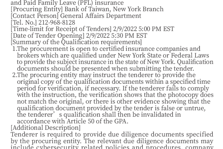 [Procuring Entity] Bank of Taiwan, New York Branch