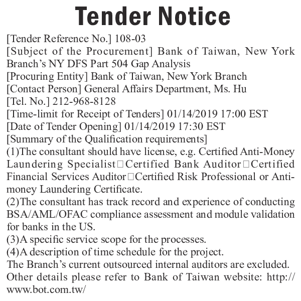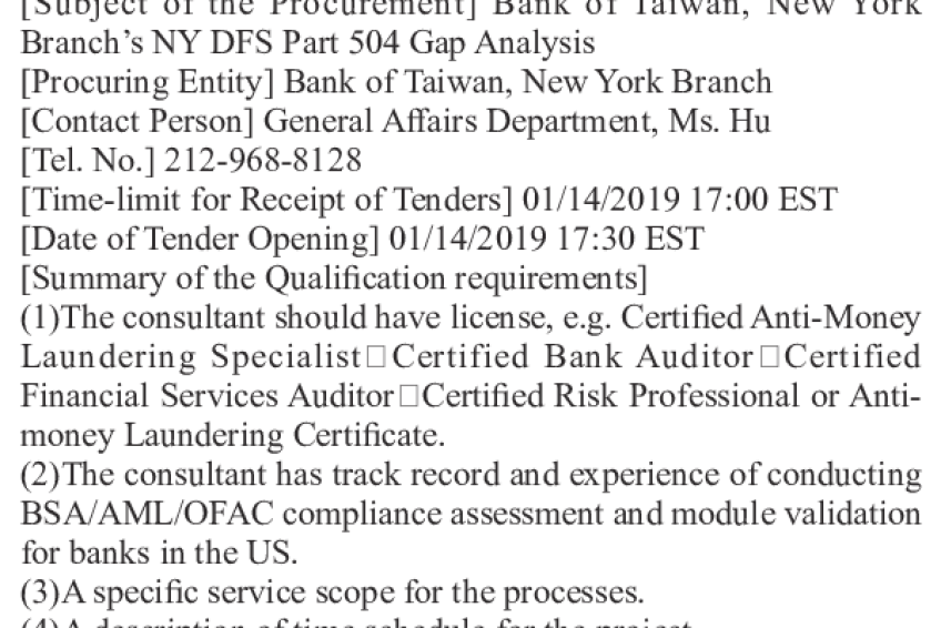 [Subject of the Procurement] Bank of Taiwan, New York Branch’s NY DFS Part 504 Gap Analysis