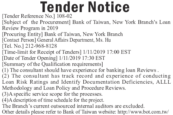 [Subject of  the Procurement] Bank of Taiwan, New York Branch’s Loan Review Program in 2019