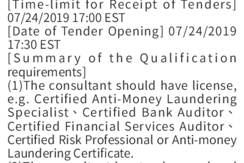(1)The consultant should have license, e.g. Certified Anti-Money Laundering Specialist、Certified Bank Auditor、Certified Financial Services Auditor、Certified Risk Professional or Anti-money Laundering Certificate.