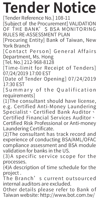 [Procuring Entity] Bank of Taiwan, New York Branch